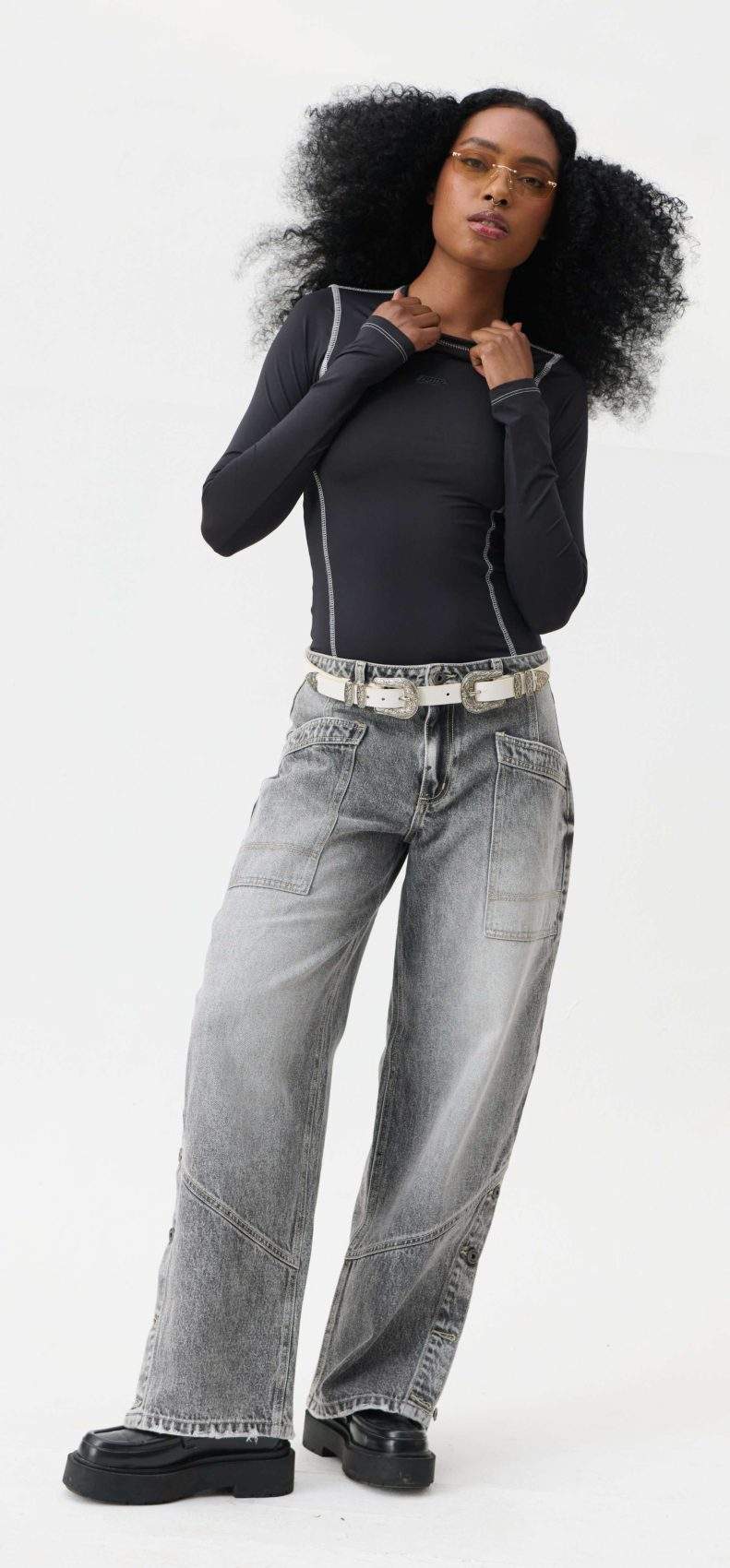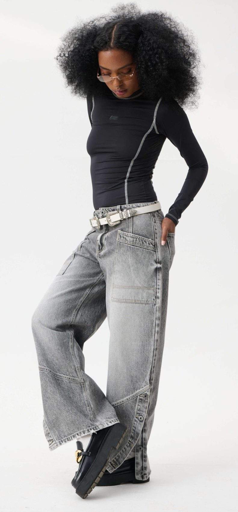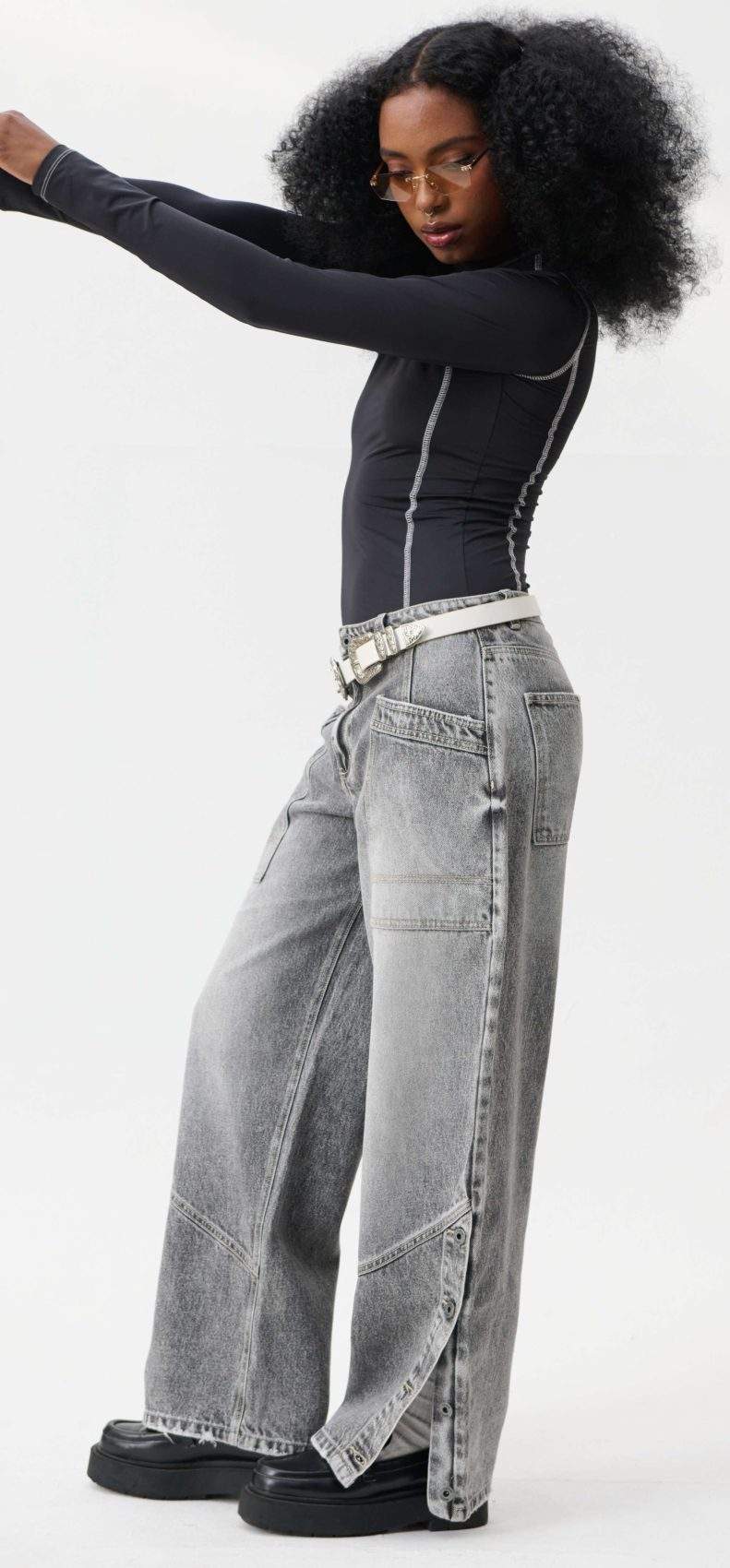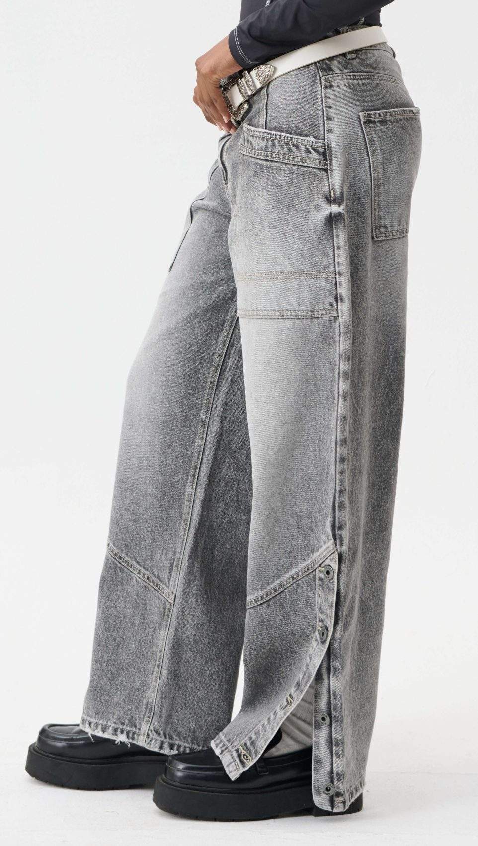 Detalles y Acabados: Proceso de lavado gris con desgastes y manualidades en contraste, confección con cortes y botones metalizados laterales en bota. Suavizado para un mejor tacto
