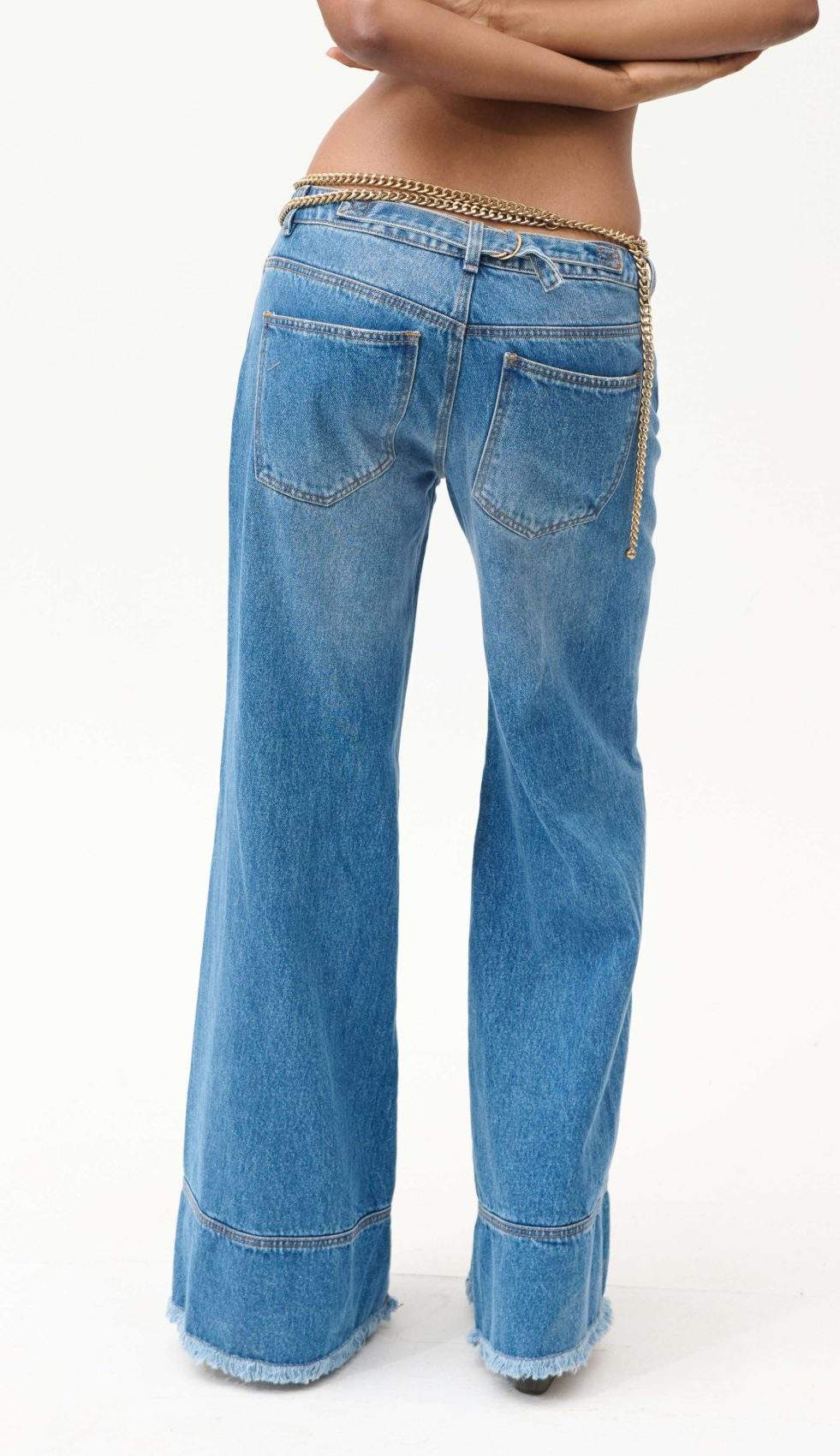 Detalles y Acabados: Wide leg fit con hebilla pavonada posterior, corte en bota y lavado frosteado con manualidades en azul medio claro